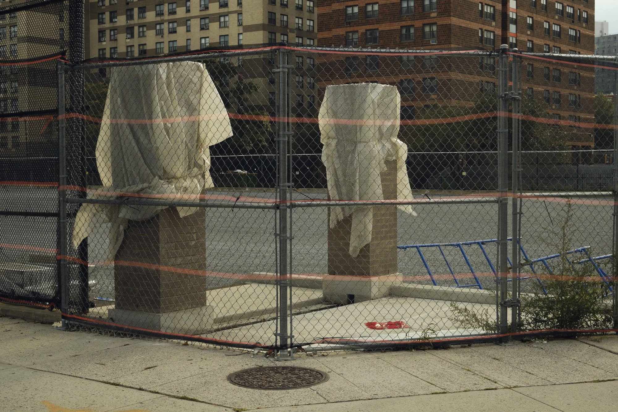 Four tall stone busts with no heads, covered with white sheets, are behind a chain-link fence on a city sidewalk. In the background, there are residential buildings. View fullsize