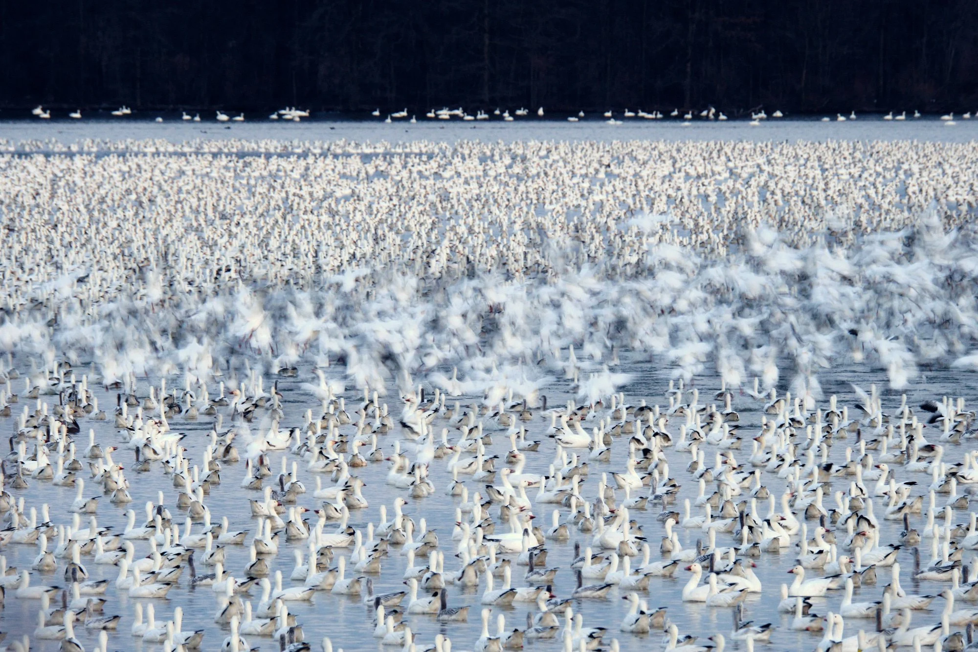A large flock of snow geese taking flight over a frozen lake surrounded by a dense forest. View fullsize