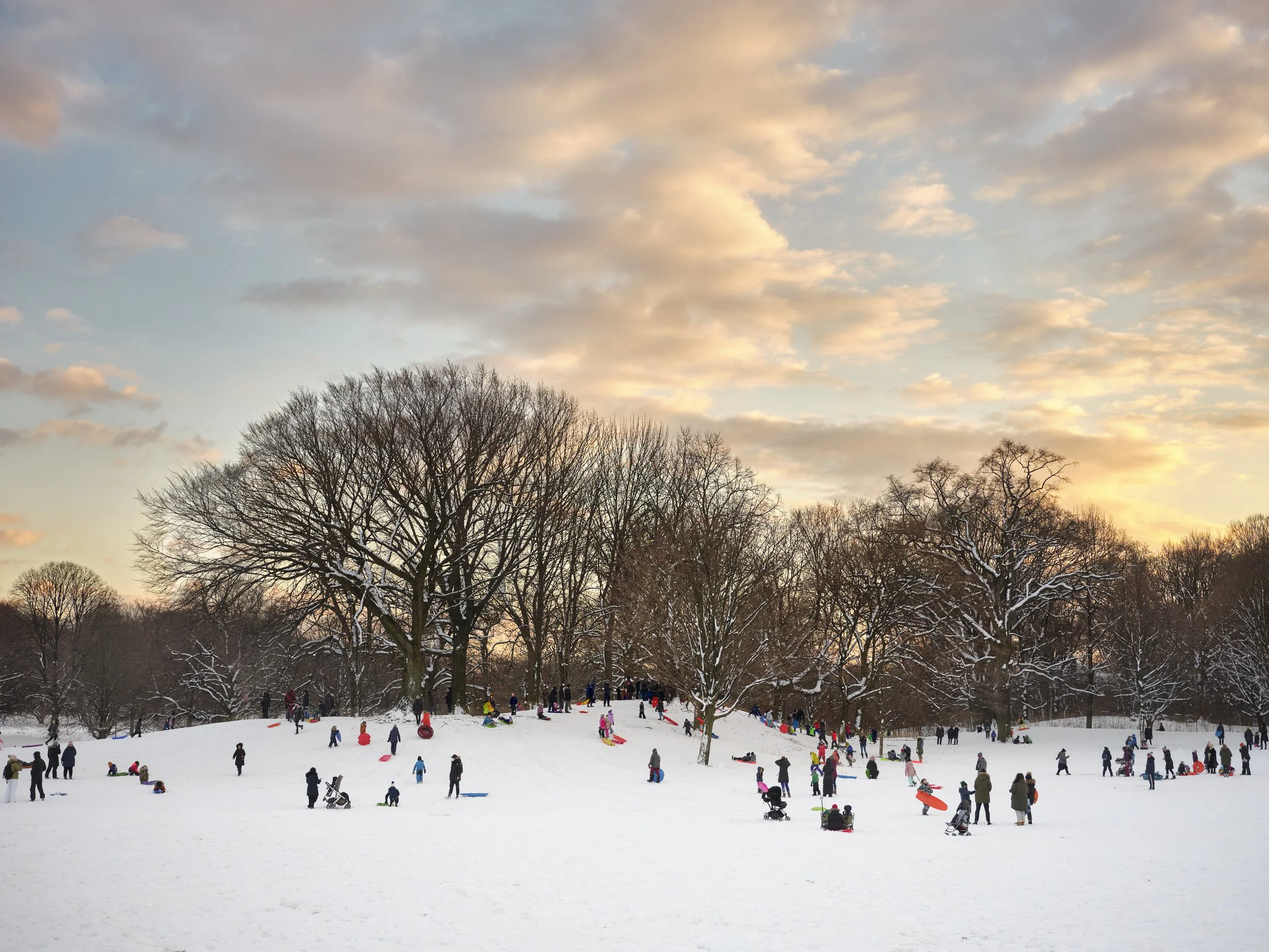 A snowy park scene at sunset with many people sledding and playing in the snow, surrounded by leafless trees.